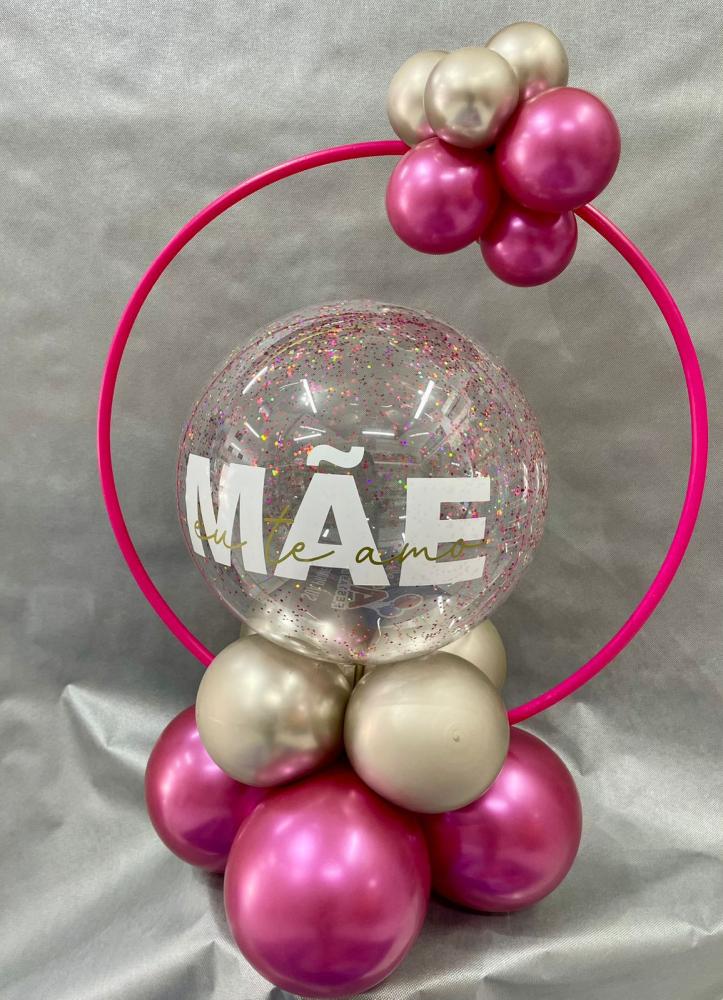 Balão bubble com personalização e confete, base de 8 balões e arco decorativo.