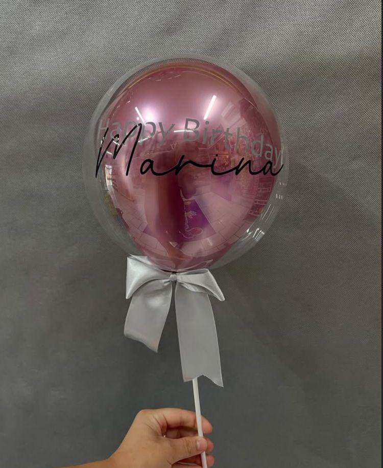 Balão bubble de 30 centímetros, balão metalizado, personalização, laço e haste.