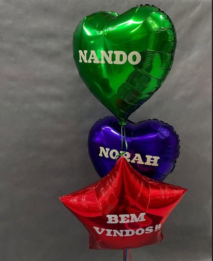 Balão de estrela, bola ou coração, suspenso no gás hélio e com personalização.